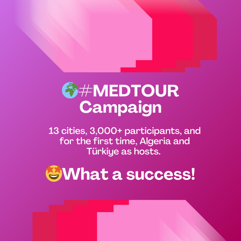 ساهمت المعالم الرئيسية مثل MEDTOUR#، الذي شهد مشاركة أكثر من 3000 مشارك في 13 مدينة (بما في ذلك الجزائر وتركيا كمضيفين لأول مرة)، والاستجابة الكبيرة لدعوتنا الأولى لتقديم المقترحات – مع 630 مقترحًا – التطلعات نحو متوسط أفضل.