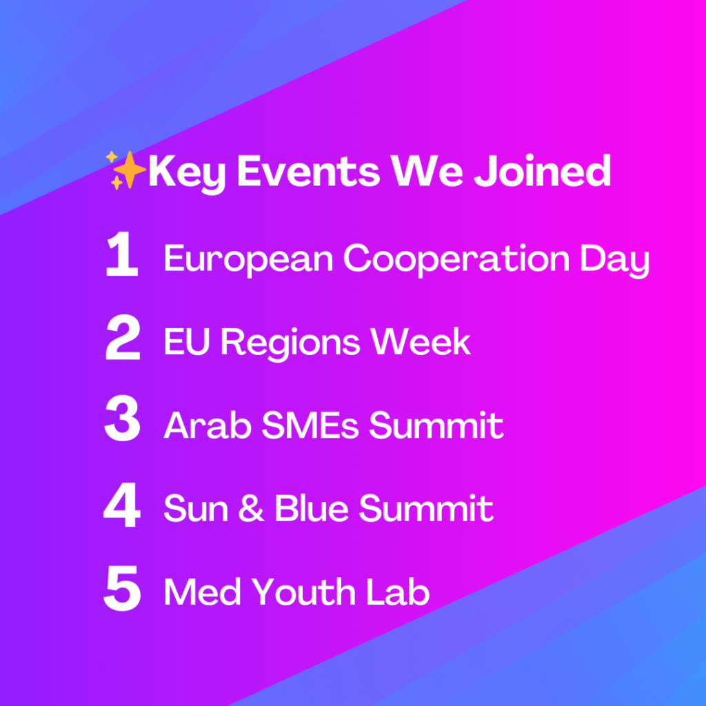 كما ألقينا الضوء على القوة التحويلية للأفراد من خلال مبادرات مثل نشرة ‘أصوات المتوسط’ وحملة POSITIVEMED#، وشاركنا في فعاليات مؤثرة مثل مؤتمر COP29 في باكو، أذربيجان، قمة الشركات الصغيرة والمتوسطة العربية في الدوحة، قطر، وأسبوع الاتحاد الأوروبي للمناطق والمدن في بروكسل.