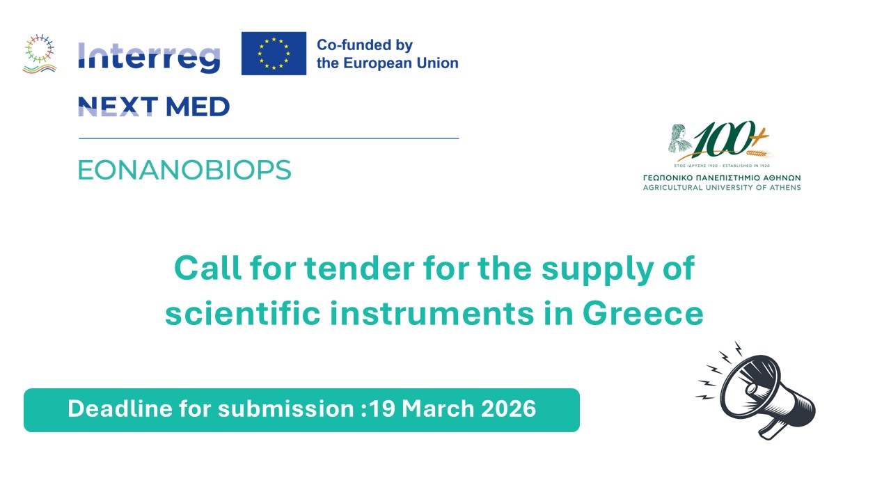 The Agricultural University of Athens (AUA), partner in the EU-funded EONANOBIOPS project under the Interreg NEXT MED Programme, has launched an open tender for the supply of scientific instruments to support the project’s research and innovation activities.