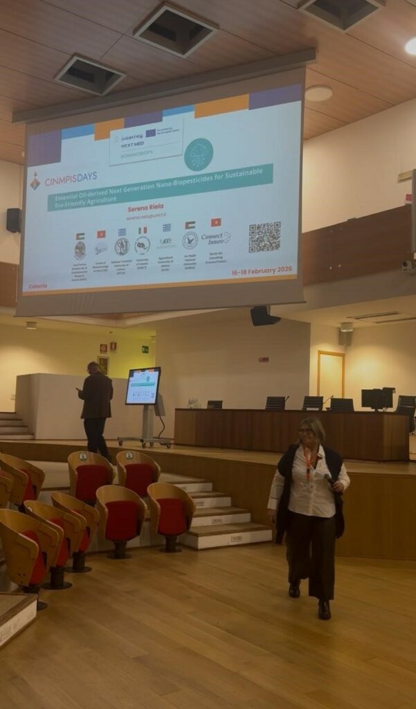 During the session, Prof. Serena Riela from the University of Catania, partner of the EONANOBIOPS project, presented the project’s work on developing essential oil–based nano-biopesticides as safer and eco-friendly alternatives to synthetic chemical pesticides, with a particular focus on sustainable tomato cultivation in the Mediterranean region.